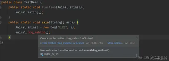 如下是向上转型, Animal animal = new Dog("旺财", 2) ,所以 animal 是无法调用 Dog 的特有方法 dog_method() 的