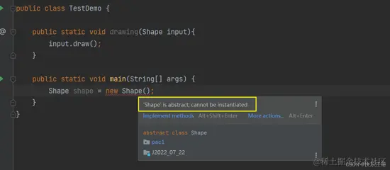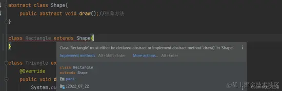 对于父类的方法,它的实现是没有意义的, 因为“画一个图形”这样的话太过抽象 ,无法具体去描述。 所以,我们可以不用实现它,将其改造为抽象方法,需要在方法返回值前加入关键字 abstract ,当某个类拥有抽象方法后它就变成了抽象类,也需要在其前面加入关键字 abstract 进行修饰