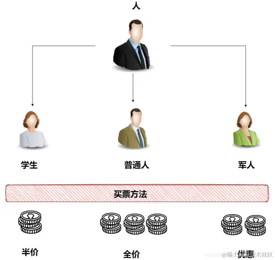 比如买票行为,学生和普通人都属于人,但是学生买票可以半价,而普通人是全票