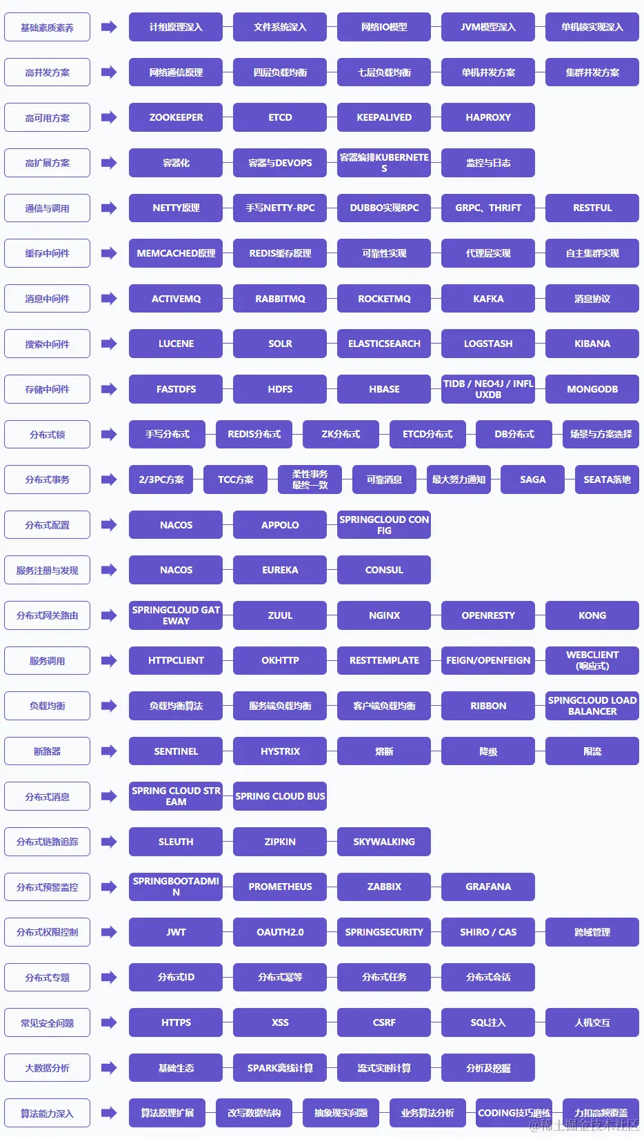 此外你会慢慢的接触到真正的有价值的代码要在设计模式和系统架构的框架下进行开发,以及学习这西相关技巧,并且再也不只是单一的应用开发,还会用到分布式架构的相关技术,如:MQ、RPC、分布式任务、分库分表组件等,之后是对于这样大量应用的部署,可以运用容器化的能力,简化部署和提升弹性。