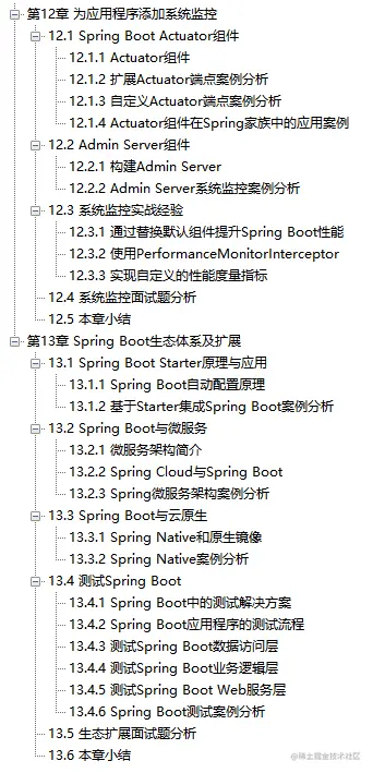 本部分内容的关注点在于如何找到Spring Boot应用程序中的性能问题并进行有效的监控和度量,通过引入Actuator组件并整合自定义的度量指标来实现这一目标。同时,将讨论Spring Boot的整个生态系统,包括SpringBoot Starter、Spring Boot与微服务、Spring Boot与云原生以及SpringBoot测试方案。