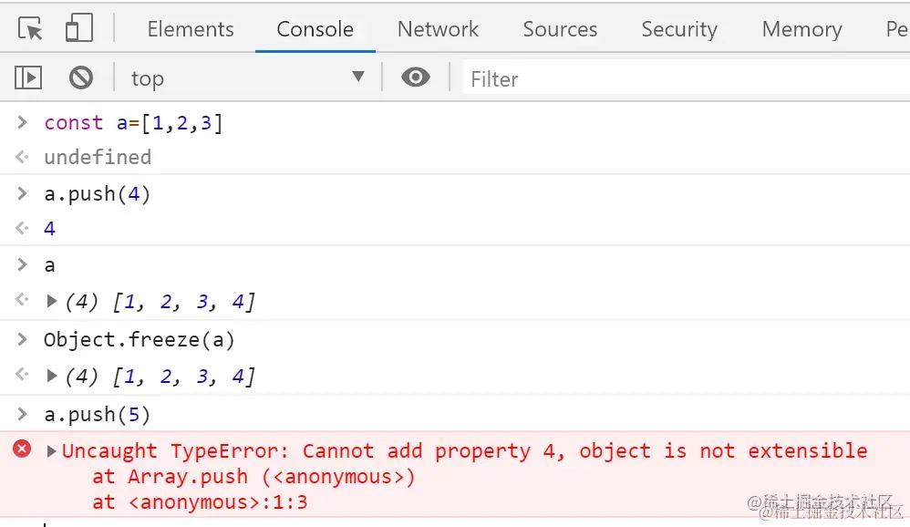 如果一个数组被声明成常量,还是可以给它添加元素的。但是被冻结之后,就连添加元素都不行了。