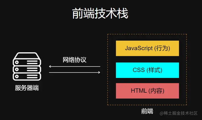 前端技术栈:通过HTML、CSS、JavaScript、网络协议与服务器端通信。