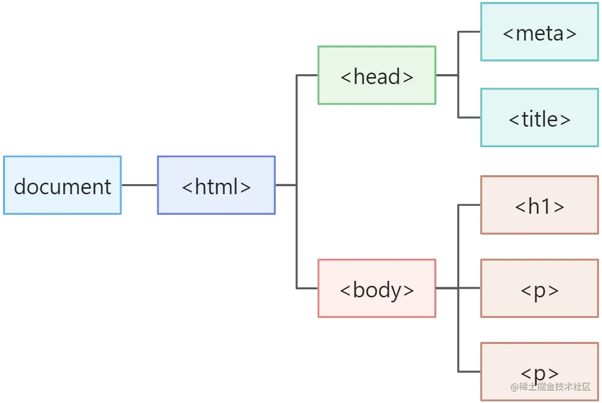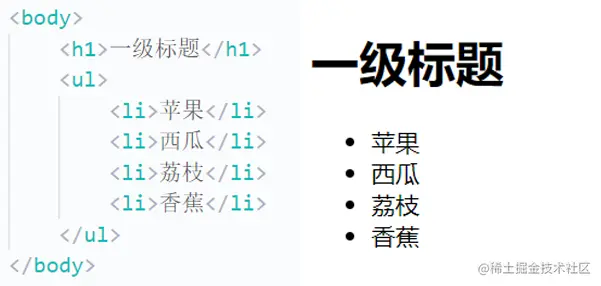 <!doctype html>声明为 HTML5 文档。<html>元素是 HTML 页面的根元素。<head>元素包含了文档的元(meta)数据。<title>元素描述了文档的标题。<body>元素包含了可见的页面内容。<h1>元素定义一个大标题。<p>元素定义一个段落。