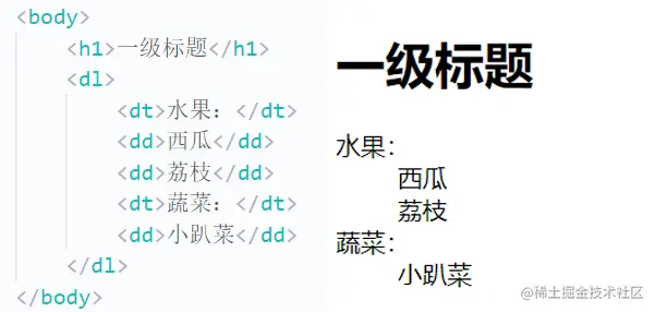 - definition lists,内部由< dt >和< dd >构成。< dt >是key,< dd >是value。