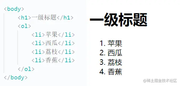 - ordered lists,内部每一项用< li >表示,自动生成序号。