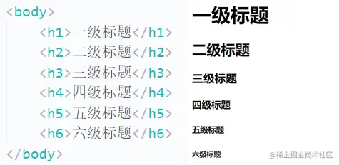 - 呈现六个不同级别的标题,< h1 > 级别最高,而 < h6 > 级别最低。