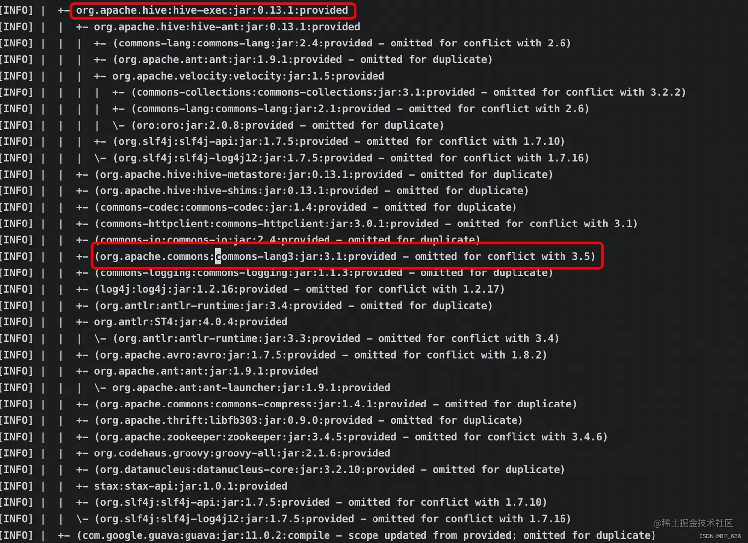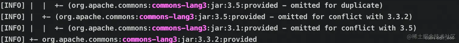 如果有童鞋没有安装 IDEA 可以使用 mvn tree 定位 common.lang3 的位置: