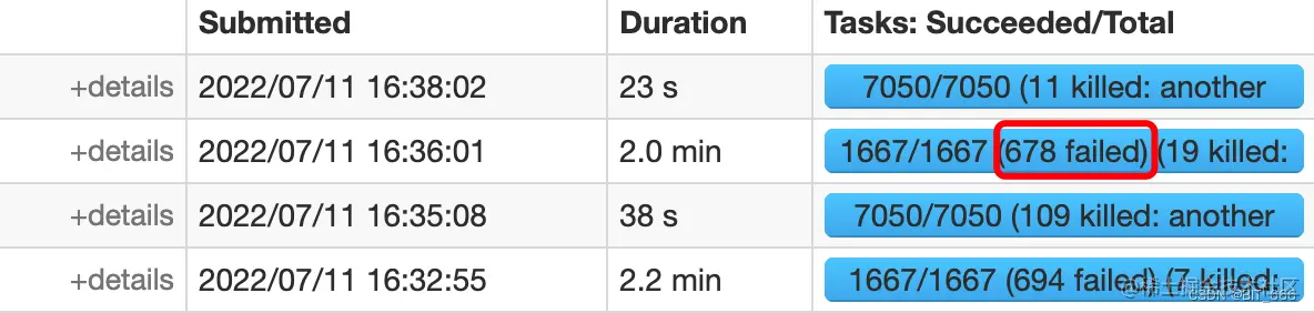 代码整体逻辑为读取文件并保存为 parquet,parquet 相关内容可以参考: Spark - 一文搞懂 parquet。添加 timestampFormat 后读取和上述保存代码运行正常,spark 任务状态为 SUCCESS,但是观察 yarn 日志发现有很多 Failed 的节点,影响任务执行效率: