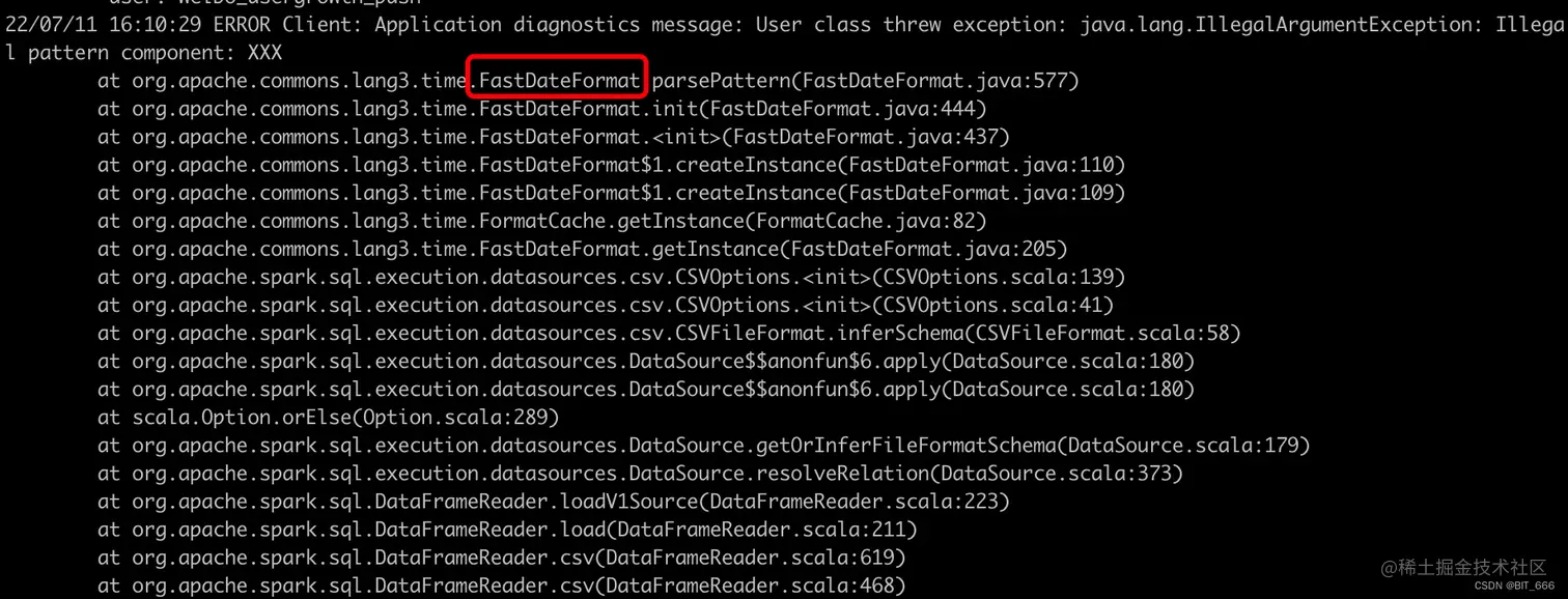 可以看到 Failed 节点上的报错又是 commons.lang3.time.FastDateFormat,和上面 java.lang.IllegalArgumentException: Illegal pattern component: XXX 异常栈指向的是同一个类即 org.apache.commons.lang3.time.FastDateFormat 类。