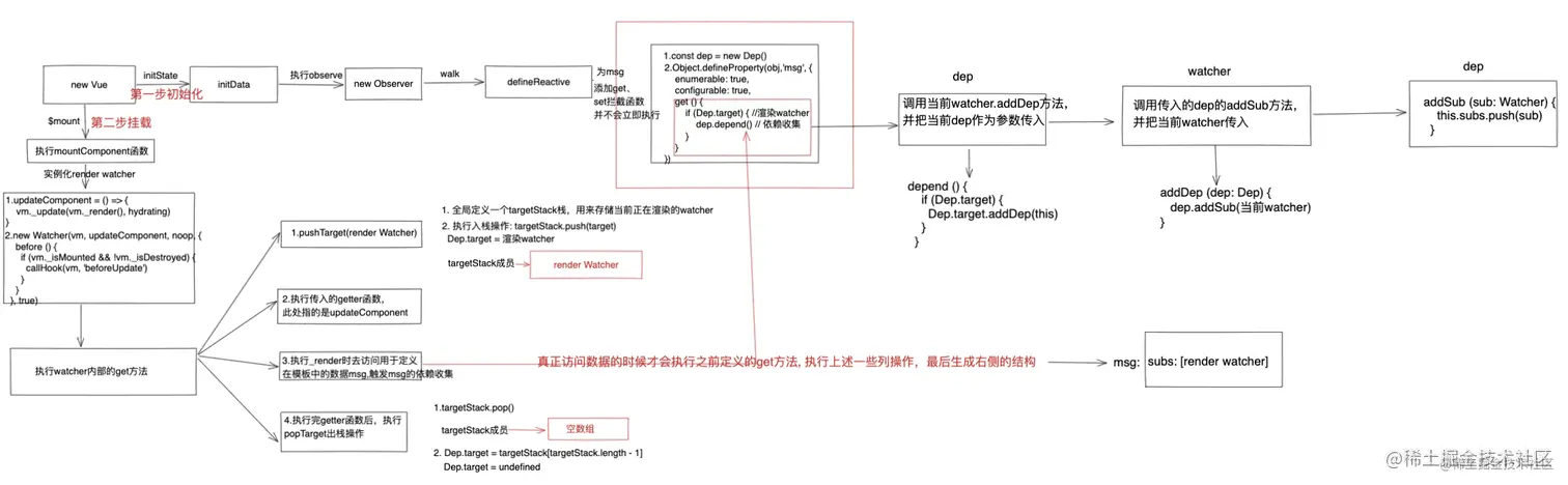 实例化会执行一次get函数(内部会执行传入的updateComponent,依次执行_render(执行render函数,触发依赖收集),_update(patch为真实dom))。当我们对数据修改后,会执行dep.notify()-> wacther.update()-> queueWatcher(watcher) -> flushSchedulerQueue -> watcher.run() -> 执行get方法(重新执行_render,因为数据已经改变了,此时拿到的是最新值,重新_update patch成真实dom)。