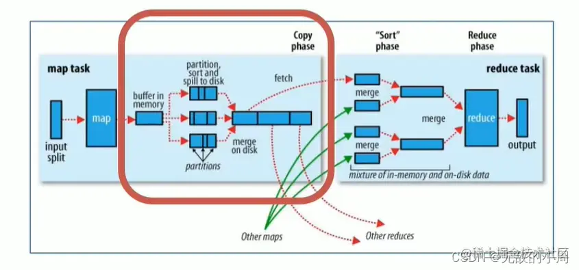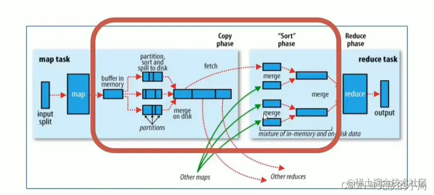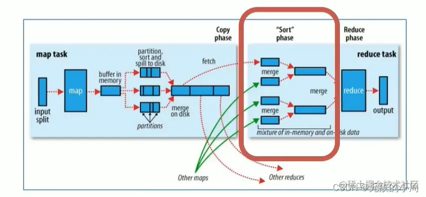 - 阶段六:对所有溢出文件进行最终的merge合并到磁盘上,成为一个文件。