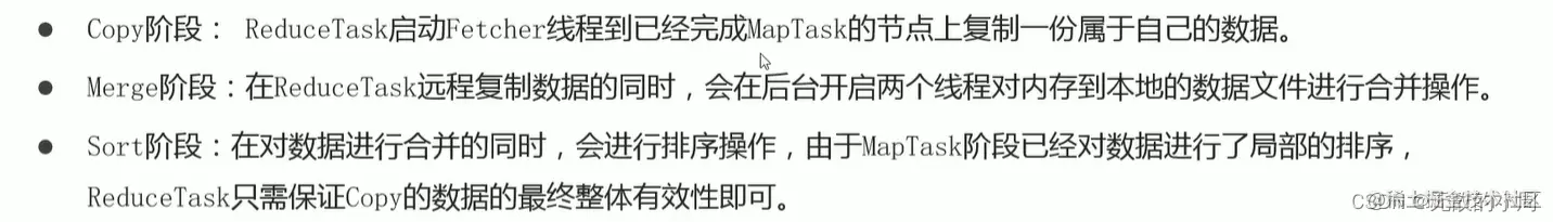- 阶段一:ReduceTask主动从MapTask复制拉取属于自己要处理的数据