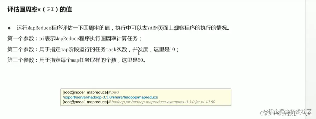 - 3.提交(运行)该程序:提交到yarn集群上分布式执行,hadoop jar hadoop-mapreduce-examples-3.3.0.jar pi 2 2 或者yarn jar hadoop-mapreduce-examples-3.3.0.jar pi 2 2 ,后面的pi 2 2为参数