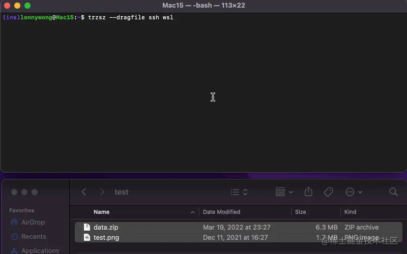 1 、在本地使用 trzsz ssh x.x.x.x 登录服务器( 若用 trzsz -d ssh x.x.x.x 登录,则支持拖文件和目录上传 )。