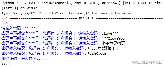 check_password = input('密码中不能含有“*”号!您还有'+str(chance)+'次机会,请输入密码:')