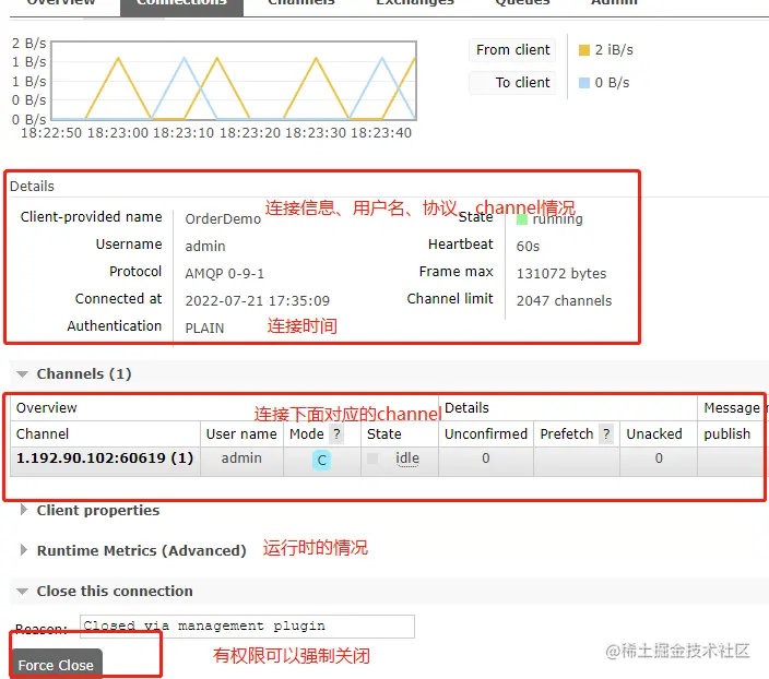 点击队列名称可以进入连接详情,如果对应的用户有权限,可以强制关掉对应的连接。