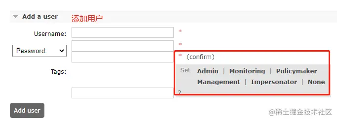 关于用户角色,RabbitMQ已经内置了几个,在创建用户时可以进行选择,如下图: