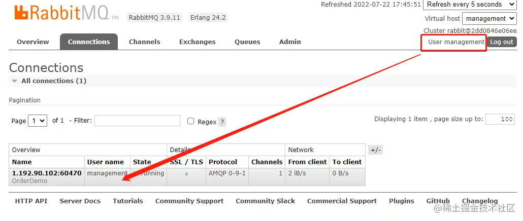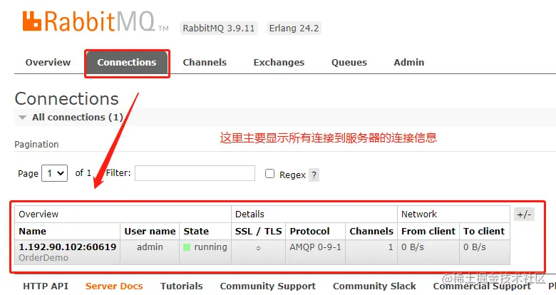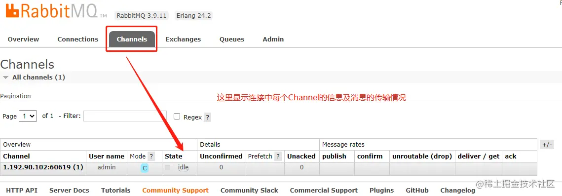 对于Connections和Channels而言,默认安装完是没有的,这里为了展示全一点的信息,搞了个客户端连上,在后续的代码实战中我们会好好仔细说说。