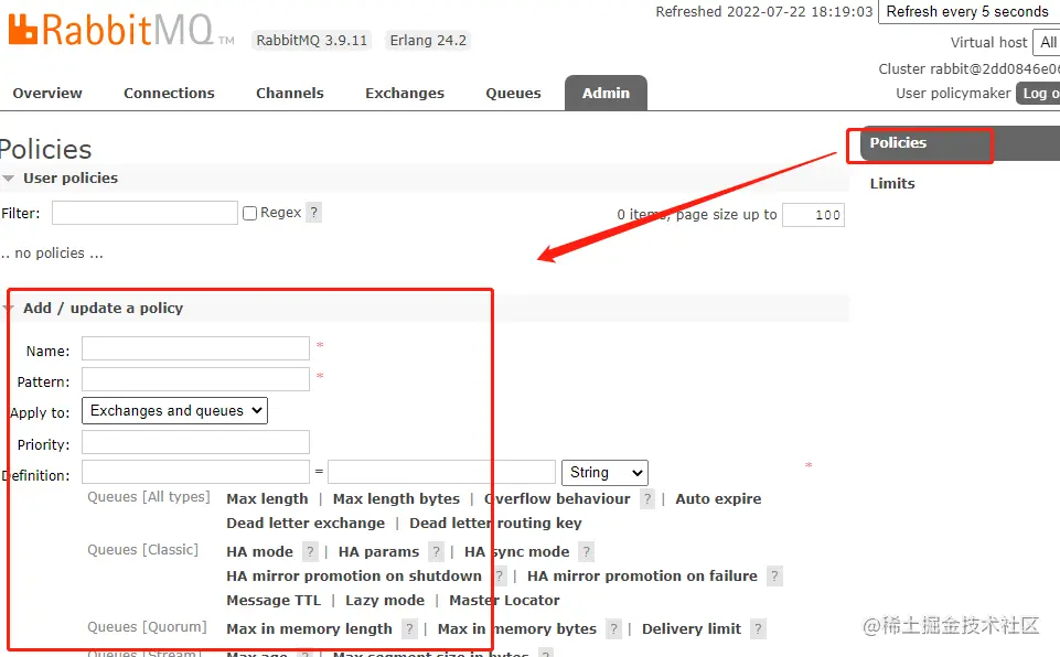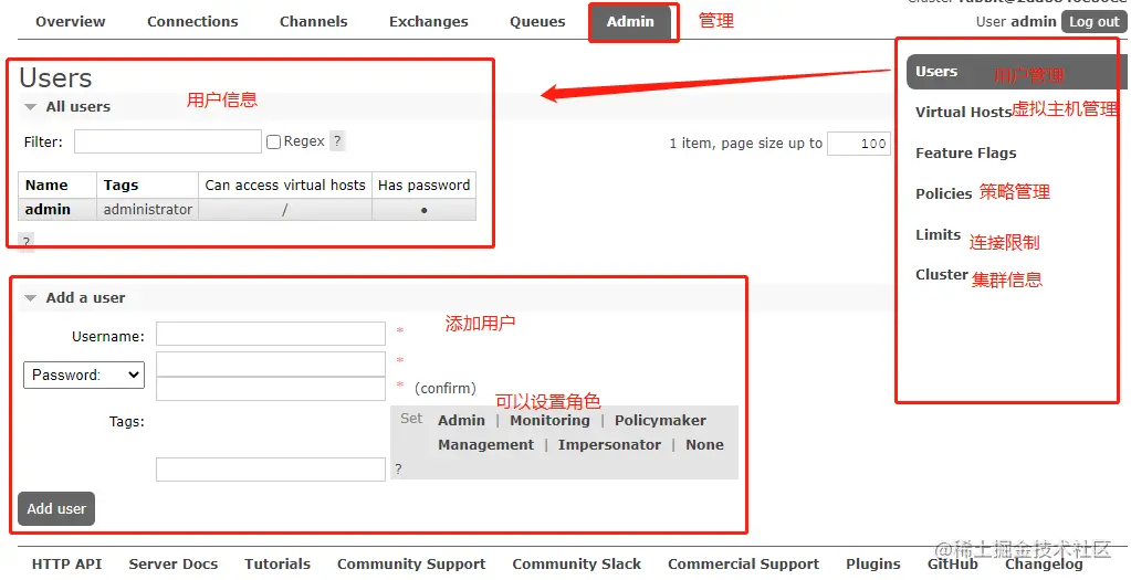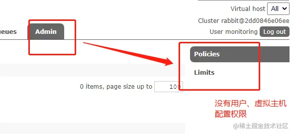 可登陆管理控制台,但无法查看节点的相关信息,主要是进行策略的管理,同时也可以管理自己的交换机、队列;