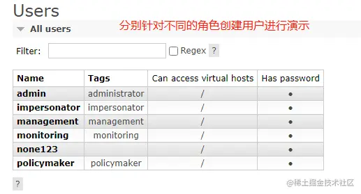 为了演示方便,针对每种角色创建对应的用户,如下: