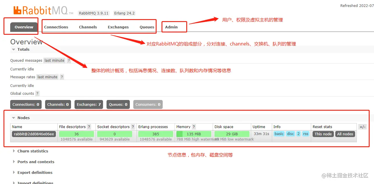 可登陆管理控制台,同时可以查看rabbitmq节点的相关信息(进程数,内存使用情况,磁盘使用情况等),可以管理对应的交换机和队列。