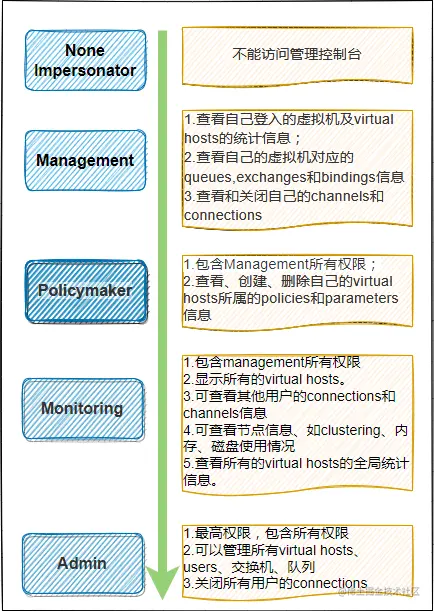 最高管理权限,可以查看所有信息并进行相关资源的管理,如:创建和删除Virtual Host、创建和删除用户、创建permmission、关闭所有用户的连接。