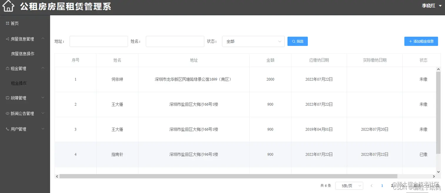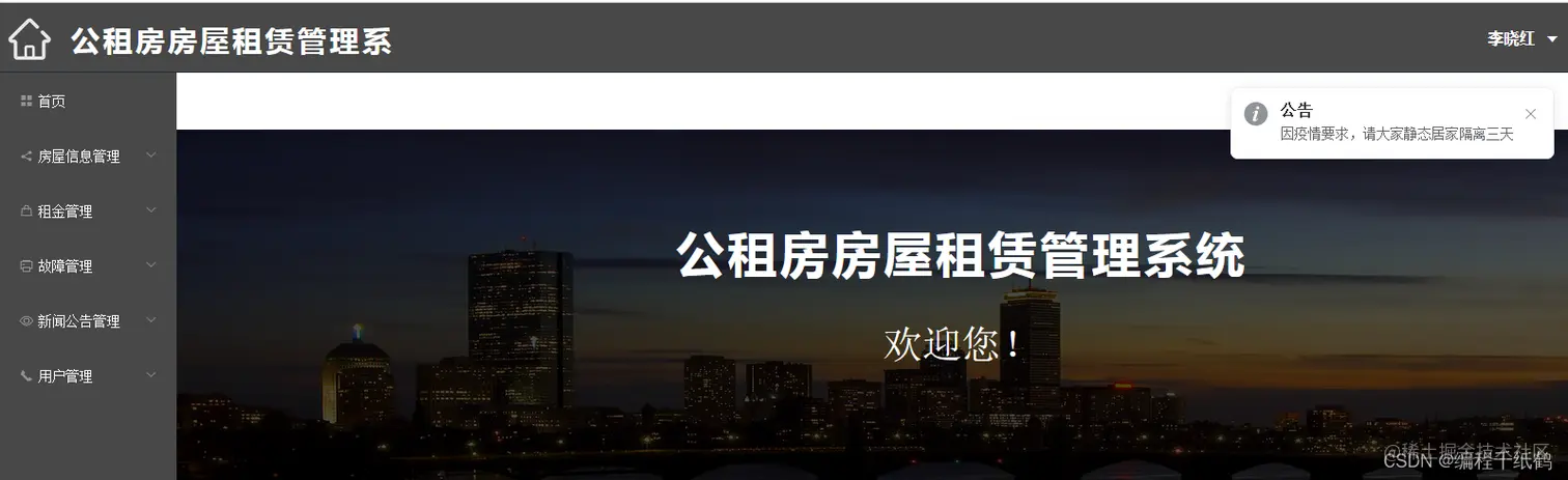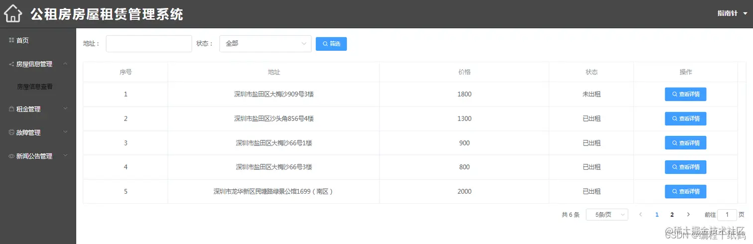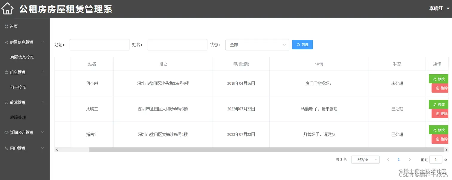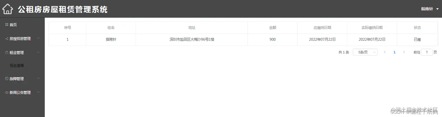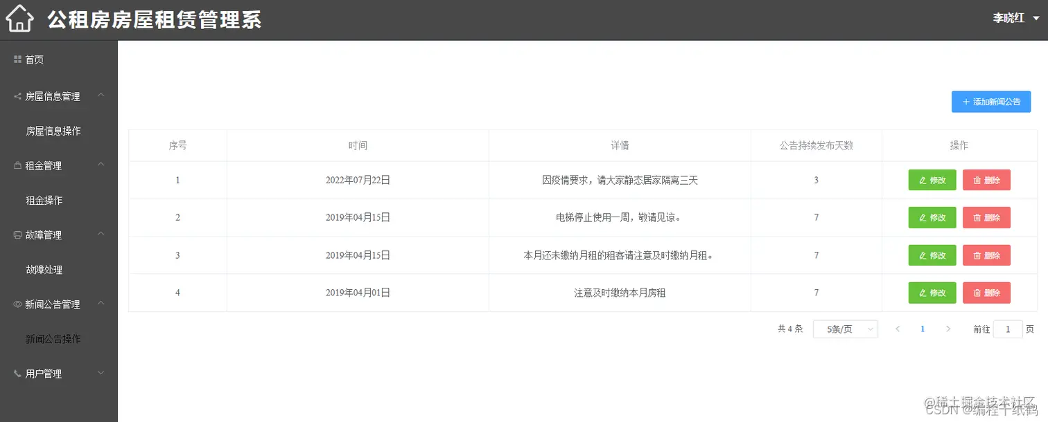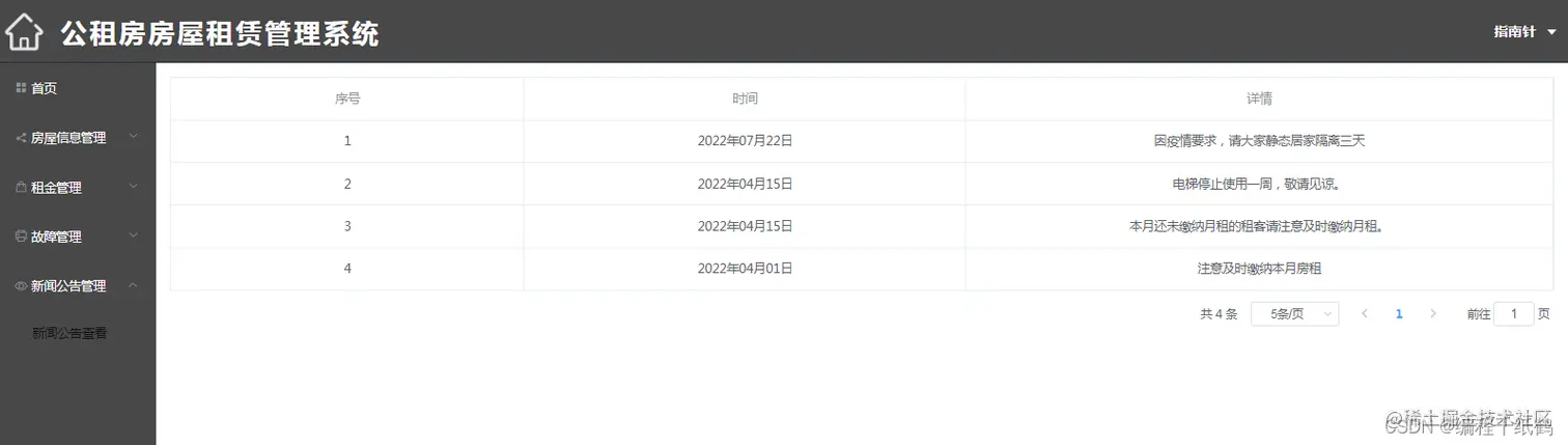 本项目主要基于Springboot+Vue实现前后端分离的公租房管理系统,主要使用用户包括系统管理员和租户。申请入驻公租房的客户在线下走申请流程,申请成功后管理员将租房信息添加到系统中,用户登陆系统查看可租的公租房信息后,由管理员添加房租出租信息,并设置租金交纳记录。租户可以在系统中添加维修申请,并可以查看系统发布的新闻公告。