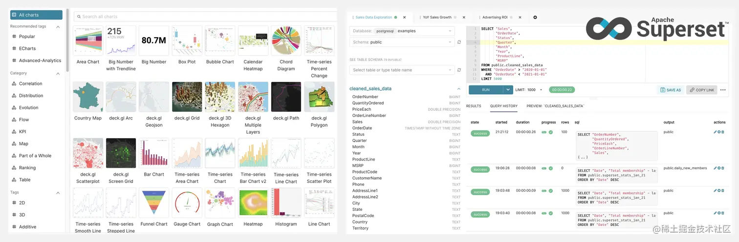 Apache Superset 是一个企业级 BI 平台,可以使用户快速、轻量、直观地探索和可视化数据,具有无代码快速构建图表、支持 SQL 编辑器、丰富美观的可视化图库、可程序化定制的 API 等功能。Repo 页面和官网(superset.apache.org)提供了多样的下载安装方式和详细的教程。