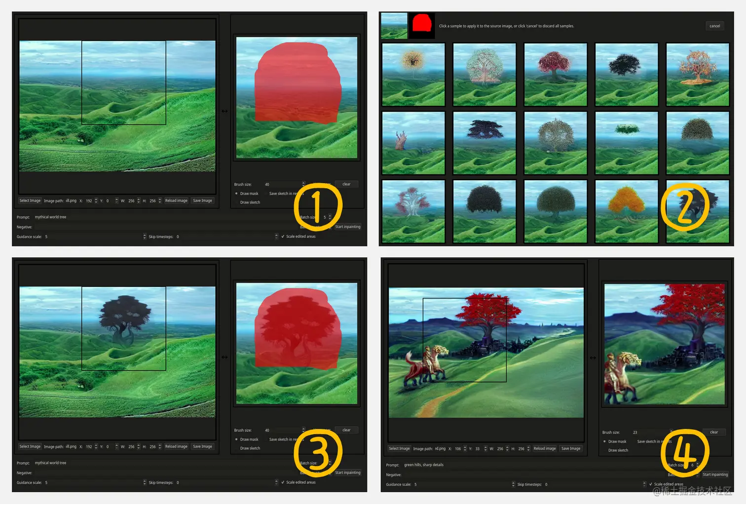 以下是一个示例的操作过程:① 标示想作画的区域,并提供关键字;② 在产生的选项中进行匹配;③ 将所选项插入到图画区域;④ 重复绘制其他区域。