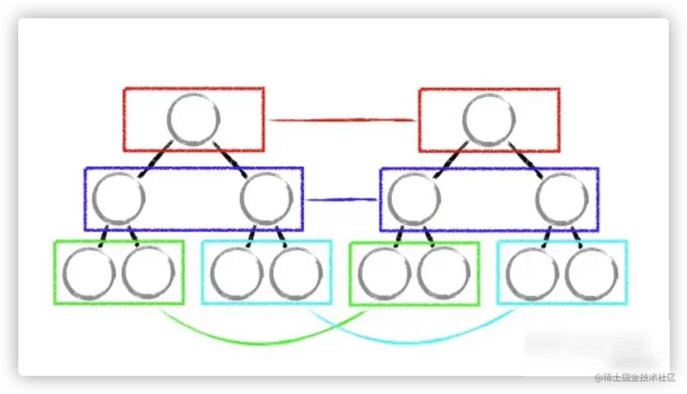 如下图,react 只会对相同颜色方框内的 DOM 节点进行比较,即同一个父节点下的所有子节点。当发现节点不存在时,则该节点及其子节点会被完全删除掉,不会用于进一步的比较。