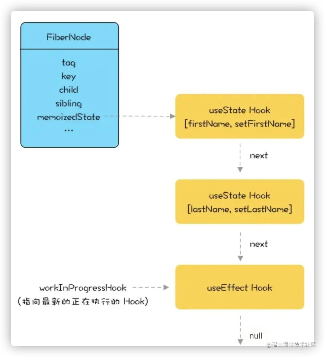 在 react 内部,每个组件(Fiber)的 hooks 都是以链表的形式存在 memoizeState 属性中: