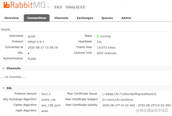 你也应该能够通过https://localhost:15671/ ,使用guest:guest 的证书访问用户界面。