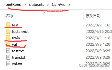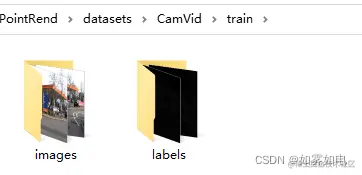 数据就用公共数据集CamVid,该数据集加背景0共12个类,标签值为0-11,下面是一级目标,目录结构及文件名务必保持一致,因为我后面在数据读取的时候添加了读自己数据集的数据导入函数,文件夹名字是固定了的,当然你也可以改代码。