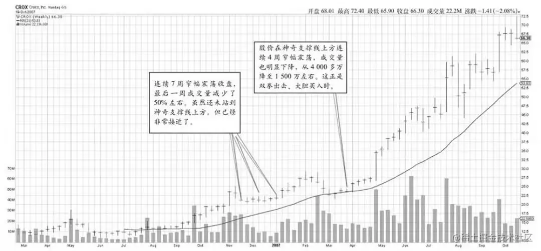 盈利公布后,该股票的基本面发生了明显的改善,成交价跳空收盘后形成的缺口与其说是一个技术面支撑位,不如说是一个基本面的支撑位,了解内情的投资者投资者会牢牢守住这一个缺口。2 ~ 3 周是安全买入时机,在这个买入周期内,超级趋势股会持续呈现几周的安静期,同时成交量也会持续下降。