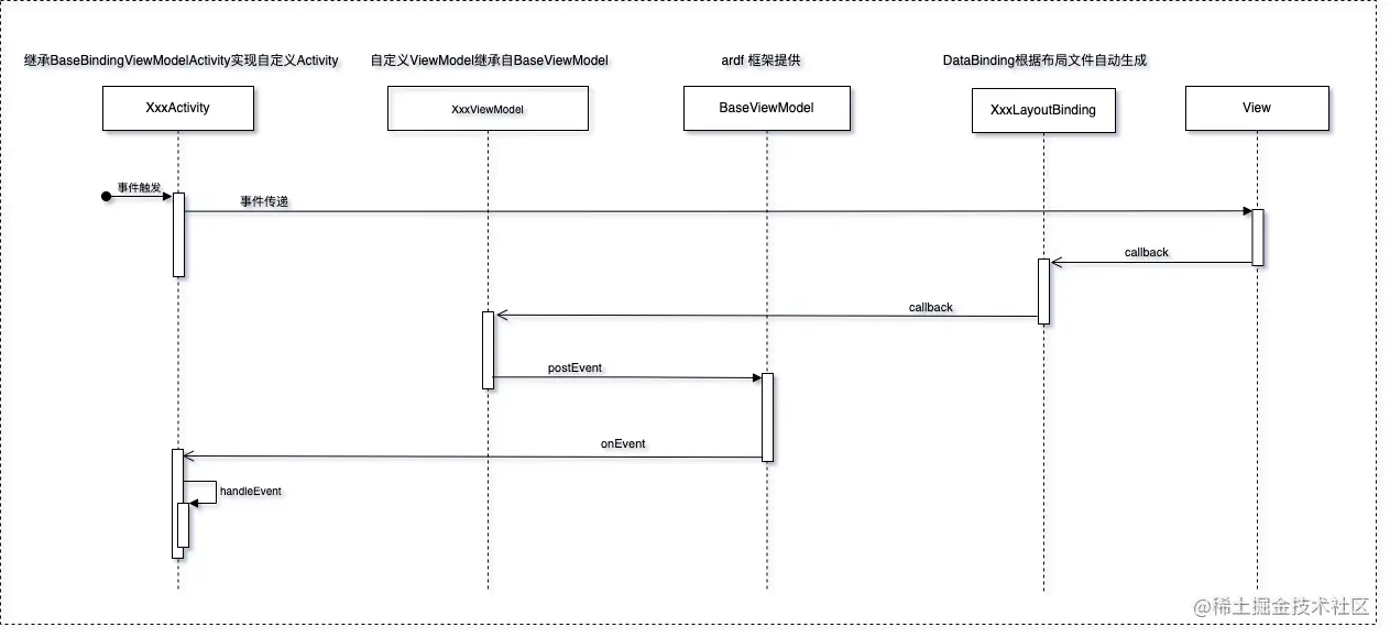 前面两步是由 Android 本身事件机制和 DataBinding 来完成的,第三步是 ardf实现的 BaseViewModel来完成的,源码如下: