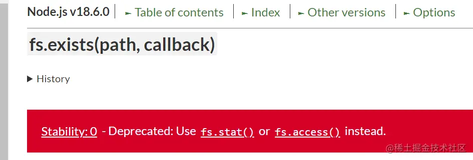 在 node 中可以通过 fs.exists() 来判断是否存在对应的文件,但在官方文档中已经被废弃了: