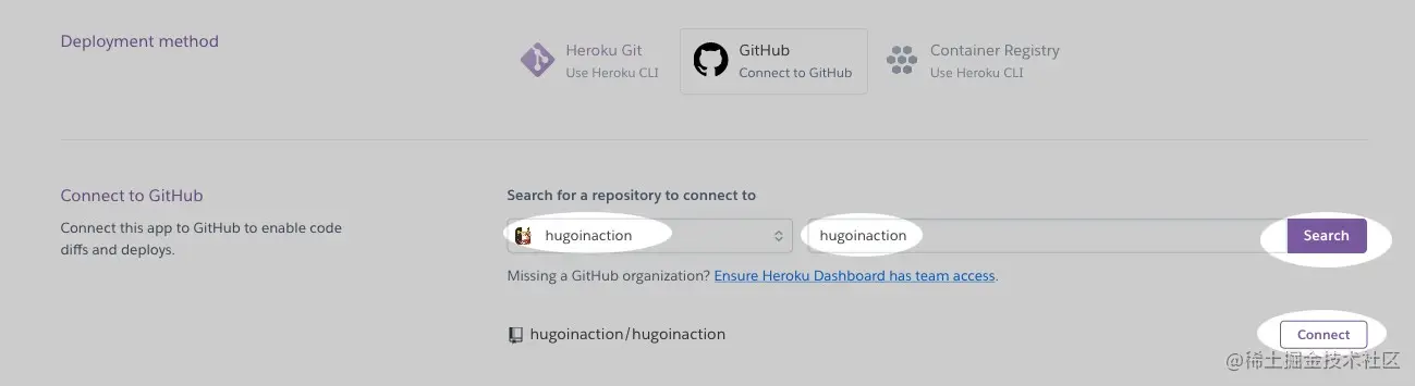 - 提供凭证后,我们可以搜索要连接到Heroku的仓库,选择正确的仓库,然后点击连接。