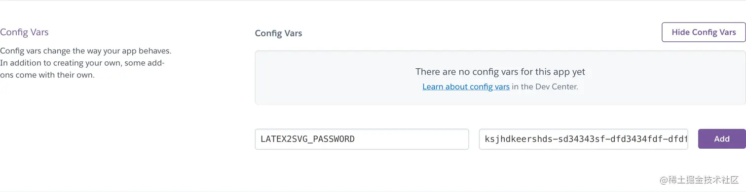 - 在设置中,还有一个config vars部分,我们可以在这里定义我们的环境变量。我们需要定义LATEX2SVG_PASSWORD来获取密码以限制访问。
