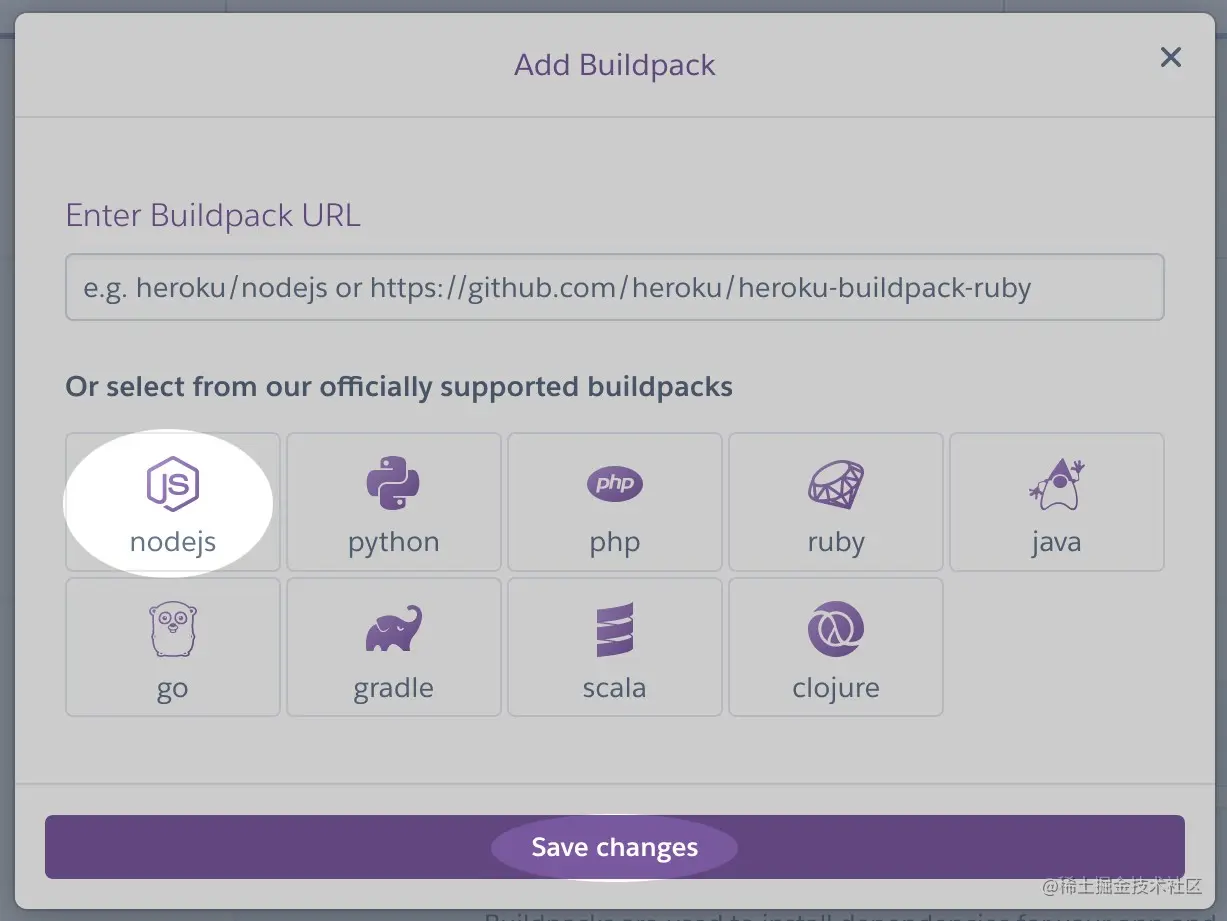 - 在触发部署之前,我们需要进入设置标签,在Buildpacks部分选择node.js。因为我们同时有
