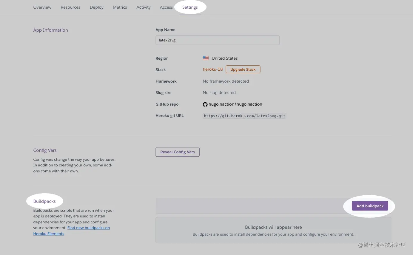 图11.Heroku的设置选项卡包含Buildpacks,这是Heroku的编程平台的配置。
