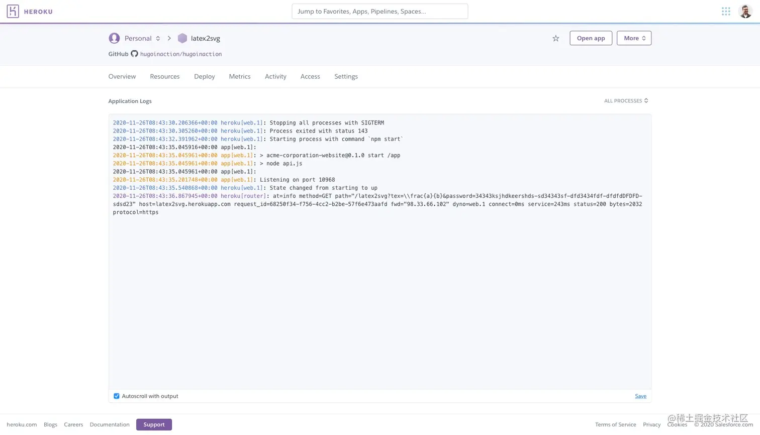 图16.查看Heroku上的日志。Heroku提供了对机器日志和构建日志的单独访问,我们可以进入这些日志来找出问题。