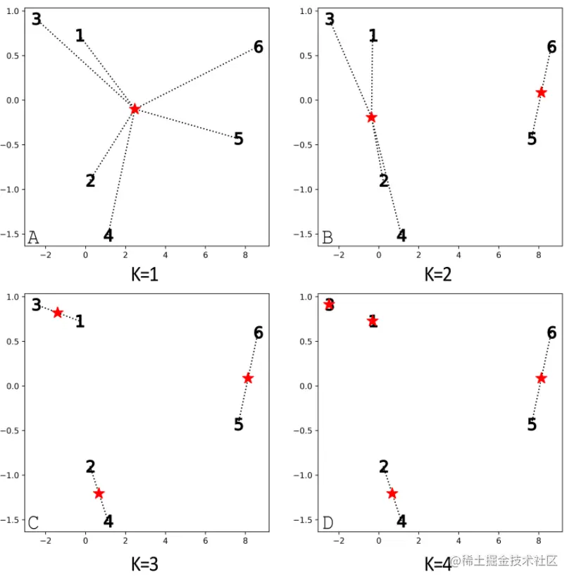 图8.六个编号为1到6的点被绘制在二维空间。用星星标记的中心是在不同的K值下计算出来的。从每一个点到它最近的中心都画一条线。惯性是通过六条线的平方长度之和计算出来的。(A)K=1。所有六条线都从一个中心延伸出去。惯性是相当大的。(B)K= 2。5点和6点非常接近第二个中心。惯性减小。©K= 3.点1和点3在很大程度上更接近一个新形成的中心。点2和点4也大大接近了一个新形成的中心。惯性从根本上减少了。(D)K= 4。点1和点3现在与它们的中心重合。它们对惯性的贡献已经从一个非常低的值转变为零。剩下的四个点和它们相关的中心之间的距离保持不变。因此,将K从3增加到4引起了非常小的惯性减少。