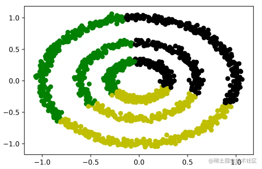 其输出结果是完全失败的!K-means将数据剖析成三个对称的片段,而每个片段都跨越了多个环。这个解决方案与我们的直觉预期不一致,即每个环都应该属于自己的不同组。什么地方出错了?好吧,K-means假设这三个集群是由三个独特的中心定义的,但实际的环是围绕着一个中心点旋转的。集群之间的差异不是由中心性驱动的,而是由密度驱动的。每个环都是由密集的点组成的,环与环之间的空白区域是由稀疏的空间作为边界的。