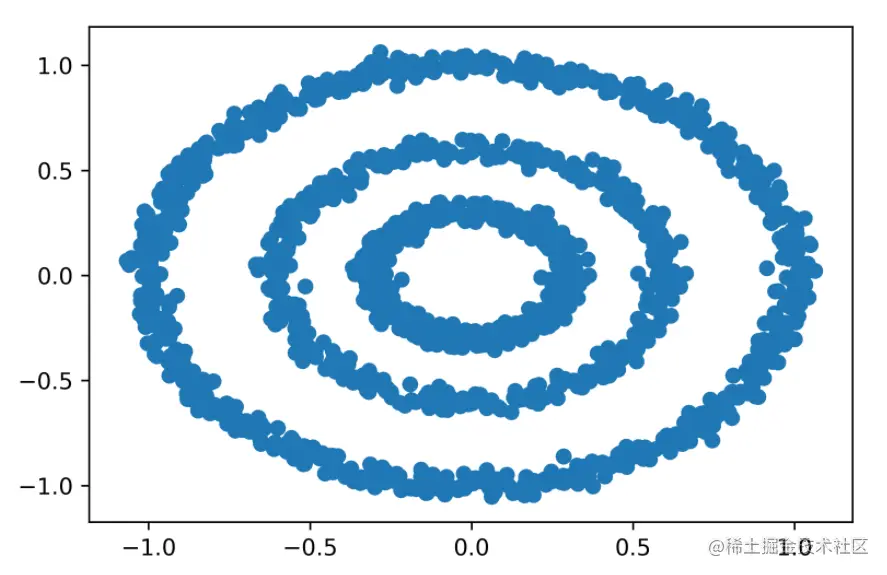 假设一位天文学家在太阳系的遥远边缘发现了一颗新的行星。这颗行星,很像土星,有多个环围绕其中心不断旋转。每个环都是由成千上万的岩石形成的。我们将把这些岩石建模为由X和Y坐标定义的单个点。让我们使用scikit-learn的makes_circles (图11),生成由许多岩石组成的三个岩环。