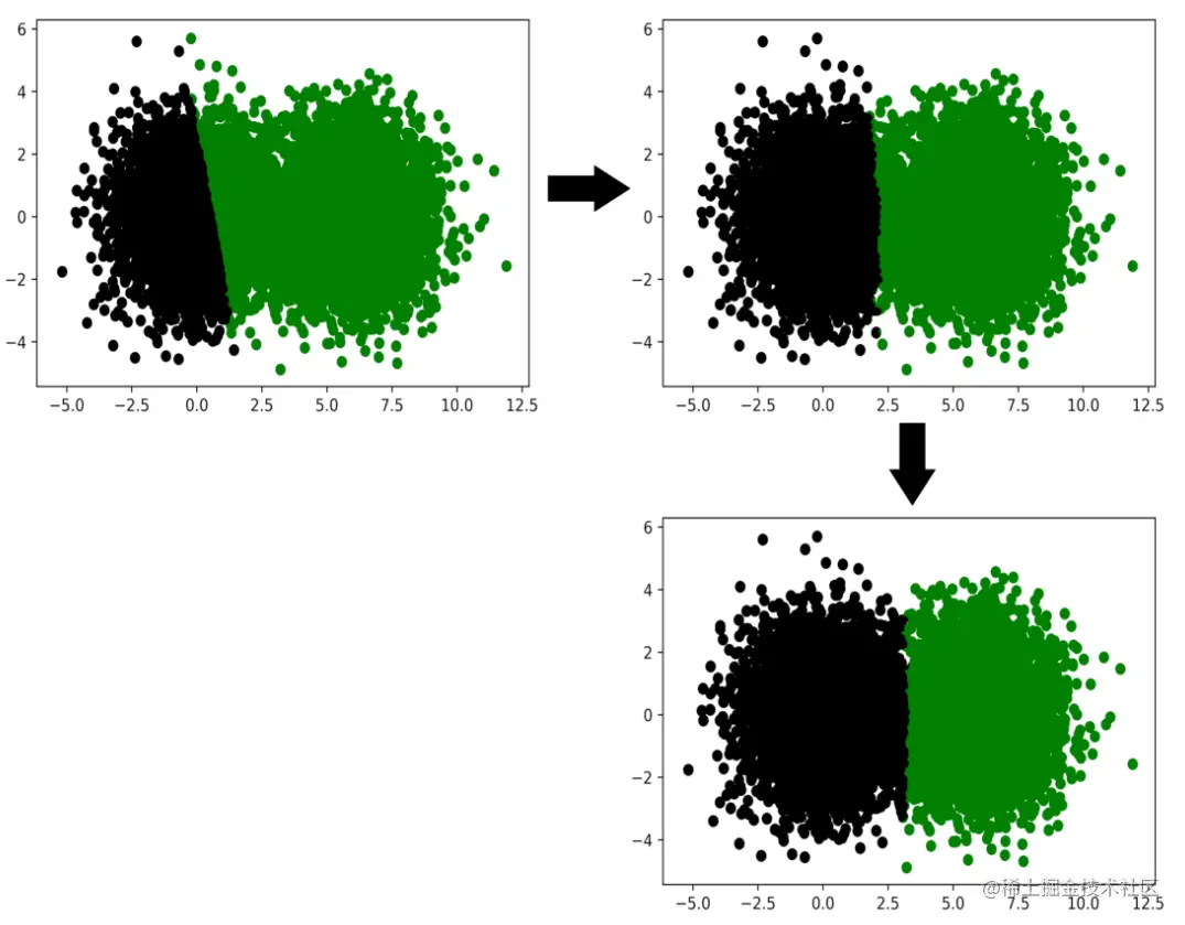 我们首先通过选择K来初始化K-means,这是我们要搜索的中心坐标的数量。在我们的镖靶分析中,K被设定为2,尽管通常K可以等于任何整数。该算法随机选择了K个数据点。这些数据点被当作是真正的中心。然后,该算法通过更新选择的中心位置进行迭代,数据科学家称之为中心点。在一次迭代中,每个数据点都被分配到其最近的中心,从而形成K组。接下来,每个组的中心被更新。新的中心等于该组坐标的平均值。如果我们重复这个过程的时间足够长,组的平均值将收敛到K个代表中心(图6)。这种收敛在数学上是有保证的。然而,我们不能事先知道收敛所需的迭代次数。一个常见的技巧是,当新计算的中心都没有明显偏离其前身时,就停止迭代。