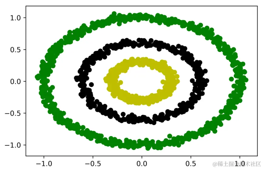 DBSCAN成功地识别了这三个岩环。该算法在K-means失败的地方获得了成功。