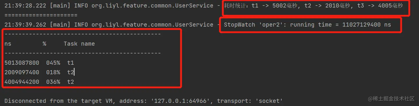StopWatch 输出的单位为纳秒 (1s = 10的9次方 ns) 还可以格式化输出更加直观,输出task名称,百分比等信息。