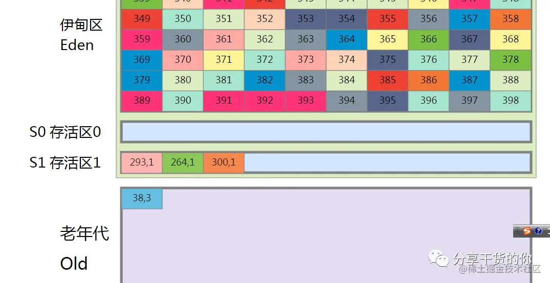 首先伊甸园的格子数值是对象的编号,下面幸存者0 和1区的 格子里面有两个数值,第二个是年龄。也就是被回收一次,年龄加一,超过最大年龄就送到老年代。 默认是15 ,现在是3.