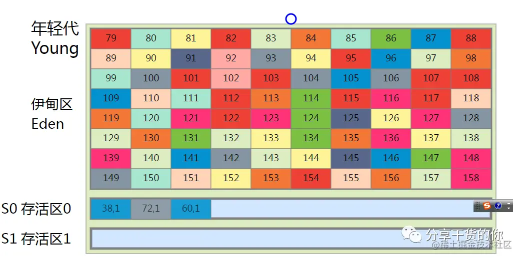 我们看到年轻代分为伊甸园区,幸存者0区,幸存者1 区。